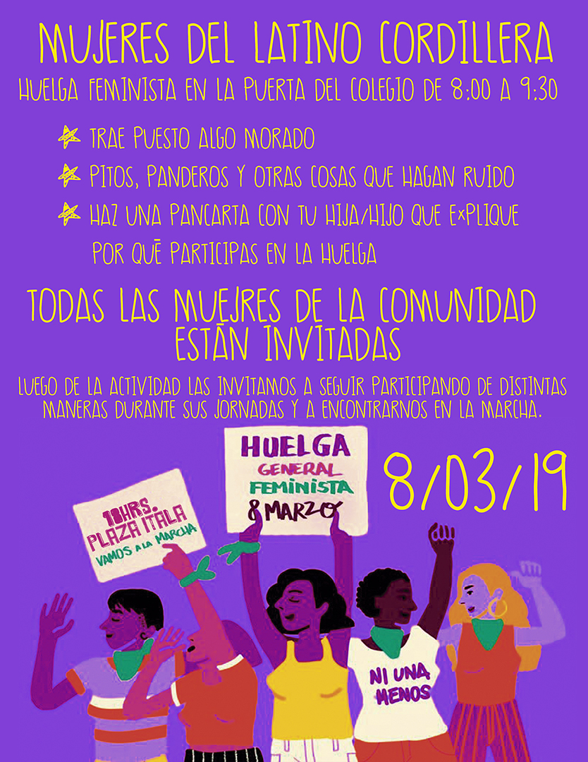 Mujeres Latinas en huelga feminista✊💜Marchan mamás, niñas y jóvenes estudiantes. Jornada de reflexión y discusión Jaqi.