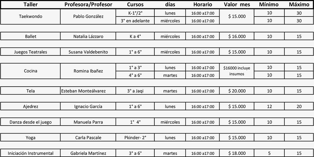 No están incluidos en la cuota: la mochila, el cepillo de dientes, pañuelos desechables, delantal y bolsa de colación en el caso de niños y niñas de Napoki (Jardín Infantil), ni los textos para los estudiantes de Tremún (1º a 6º Básico), los que serán adquiridos directamente por cada apoderado o apoderada.